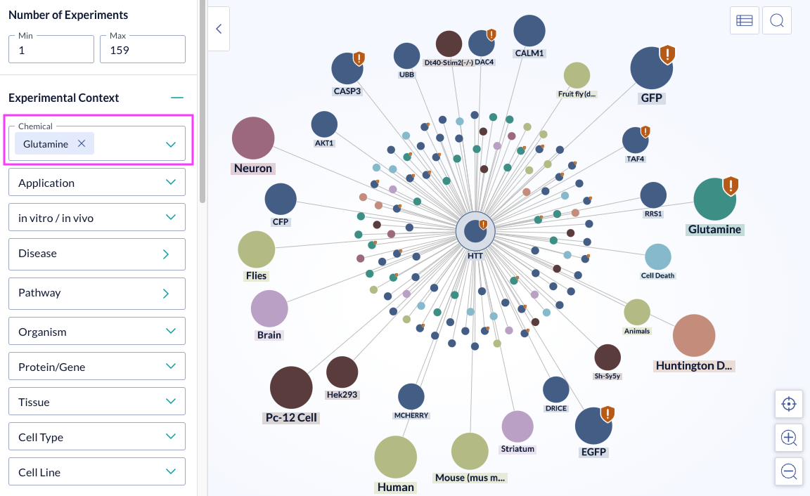Experimental context filters, such as Disease, Pathway, or Organism, help users narrow down the evidence network and relevant biological connections. We've added a new Chemicals filter to enhance how scientists surface and discover relevant experimental data and chemical-specific evidence.